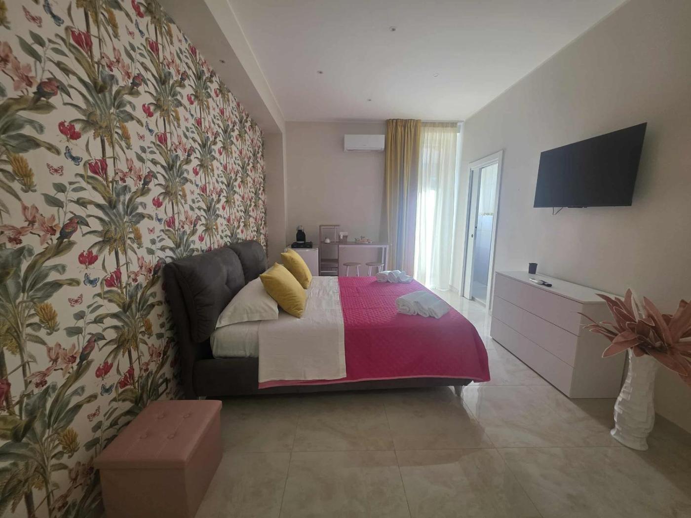 Camera Matrimoniale Deluxe. Spaziosa camera matrimoniale con aria condizionata,per la preparazione di tè e caffè e bagno privato con doccia e bidet. Lalloggio dispone di 1 letto. ;