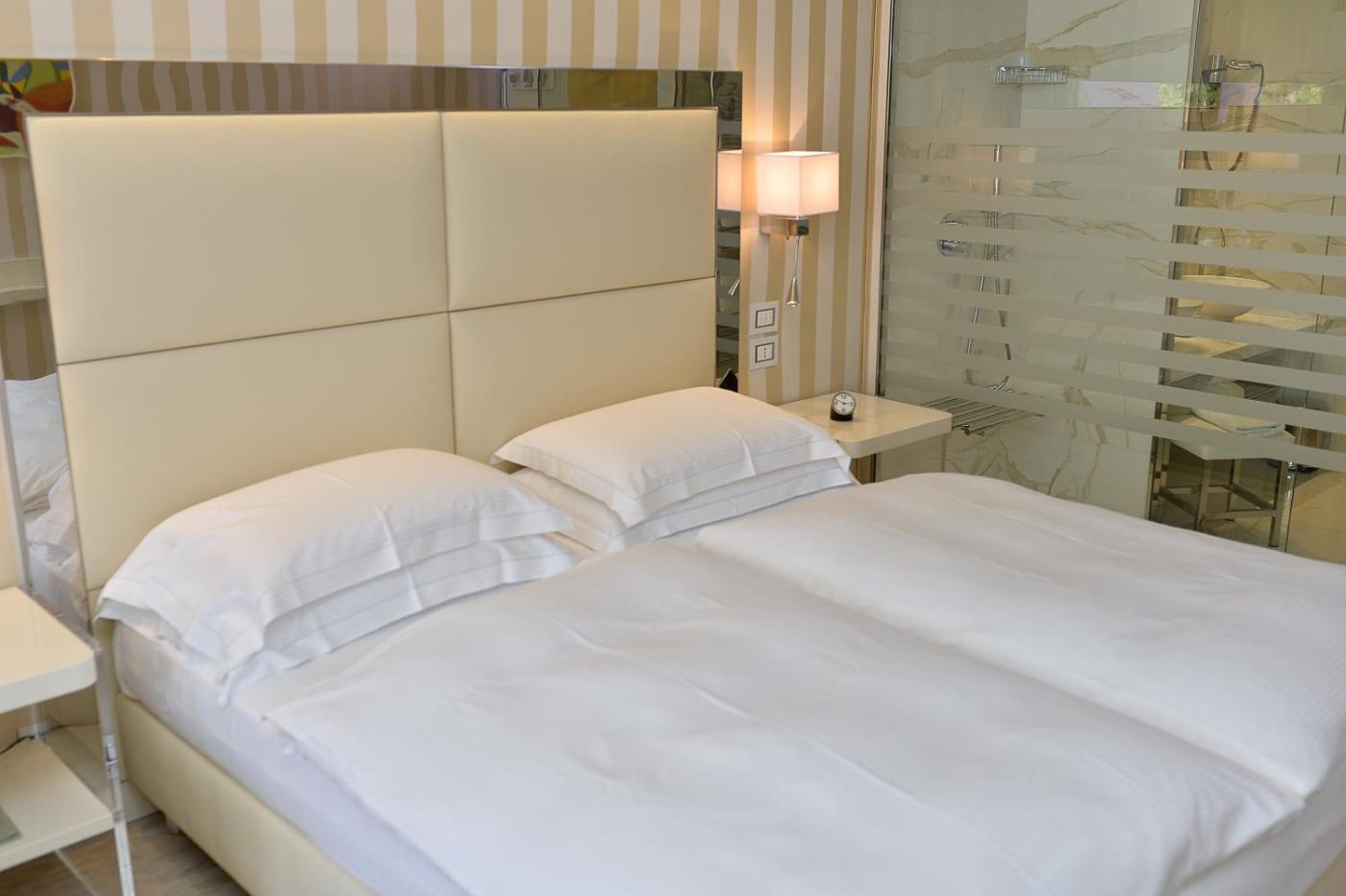 Camera Matrimoniale Prestige con Vista Giardino. Spaziosa camera matrimoniale climatizzata e insonorizzata con terrazza affacciata sul giardino e bagno privato completo di doccia a filo pavimento. Lalloggio dispone di 2 letti. ;