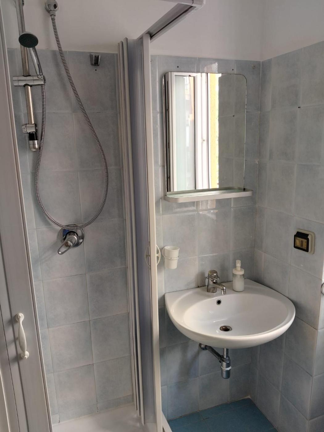Camera Doppia con Letti Singoli e Bagno in Comune. Camera doppia con letti singoli dotato di armadio, bollitore elettrico, balcone con vista sulla città e bagno in comune con doccia. L’alloggio presenta 2 letti. ;
