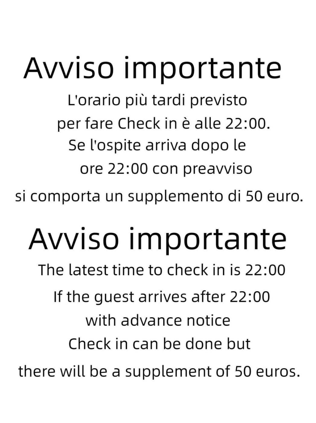 Il check-in dopo le 22:00 comporta un supplemento di 50 EUR.Siete pregati di comunicare in anticipo a lorario in cui prevedete di arrivare. Potrete inserire questa informazione nella sezione Richieste Speciali al momento della prenotazione, o contattare la struttura utilizzando i recapiti riportati nella conferma della prenotazione.
