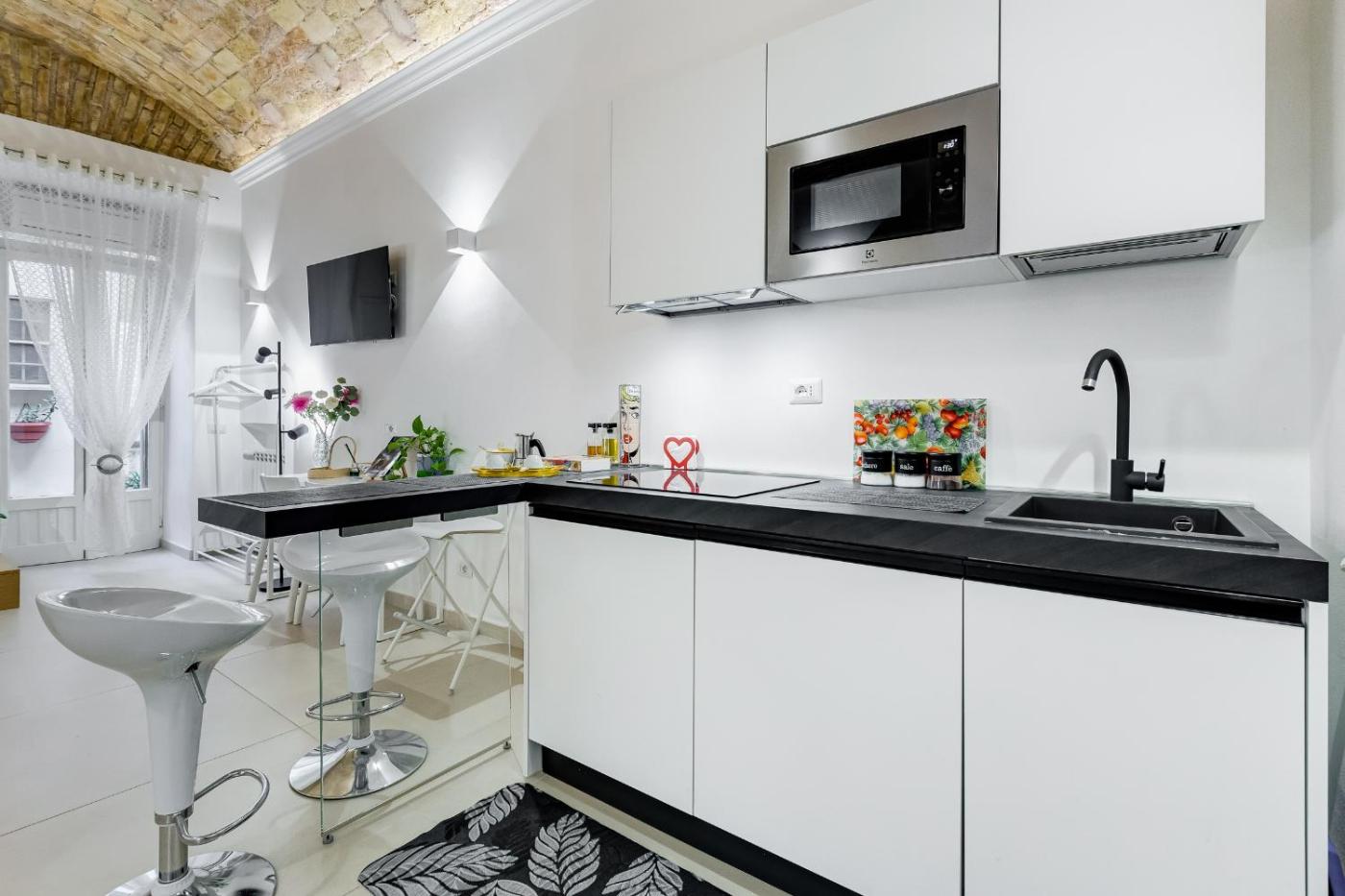Appartamento Monolocale. Questo elegante e moderno monolocale presenta soffitti a volta, un soggiorno con angolo cottura completamente attrezzato e zona pranzo, e un bagno con doccia e lavatrice. Dispone inoltre di TV a schermo piatto, aria condizionata, forno a microonde e bollitore elettrico.