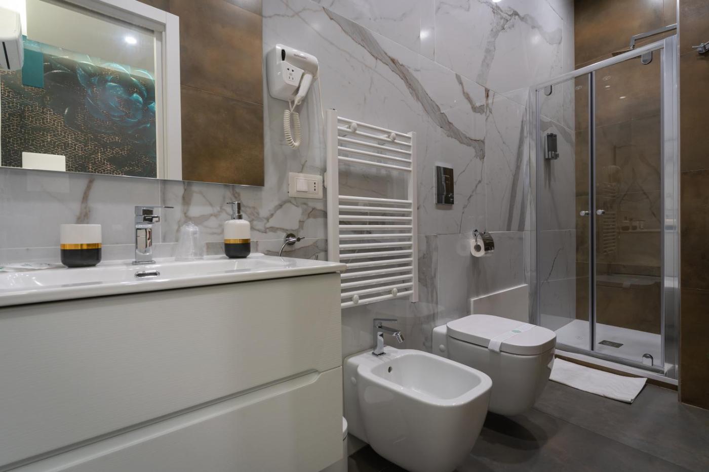 Camera Matrimoniale con Bagno Privato. Camera matrimoniale dotata di bagno privato con doccia, bidet, asciugacapelli edi cortesia. Questa sistemazione climatizzata con vista sul cortile interno presenta una TV a schermo piatto con canali satellitari e cioccolata per gli ospiti. L’alloggio dispone di 1 letto. ;
