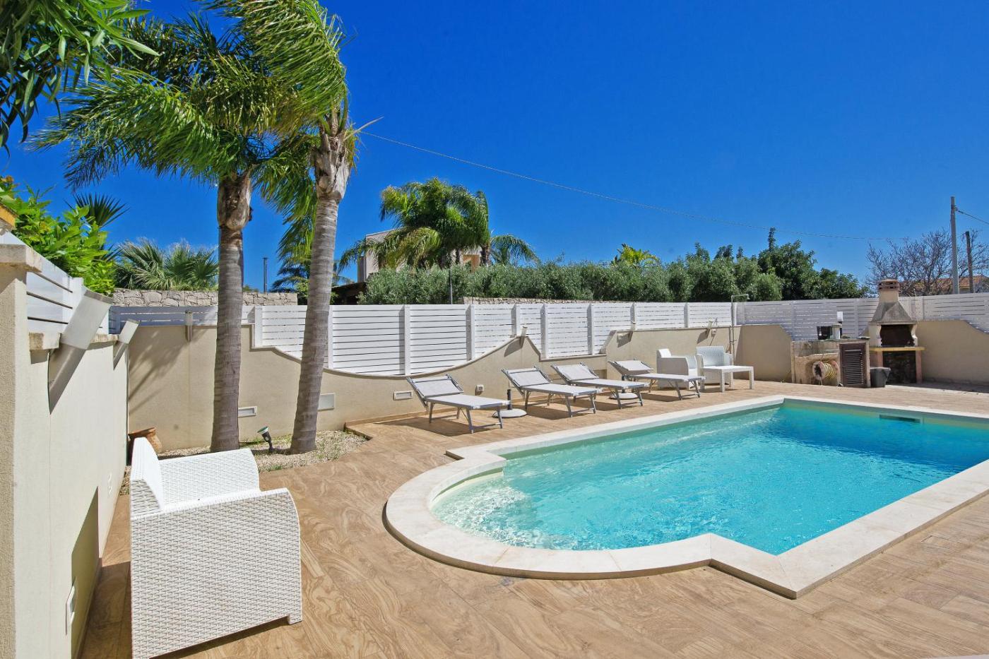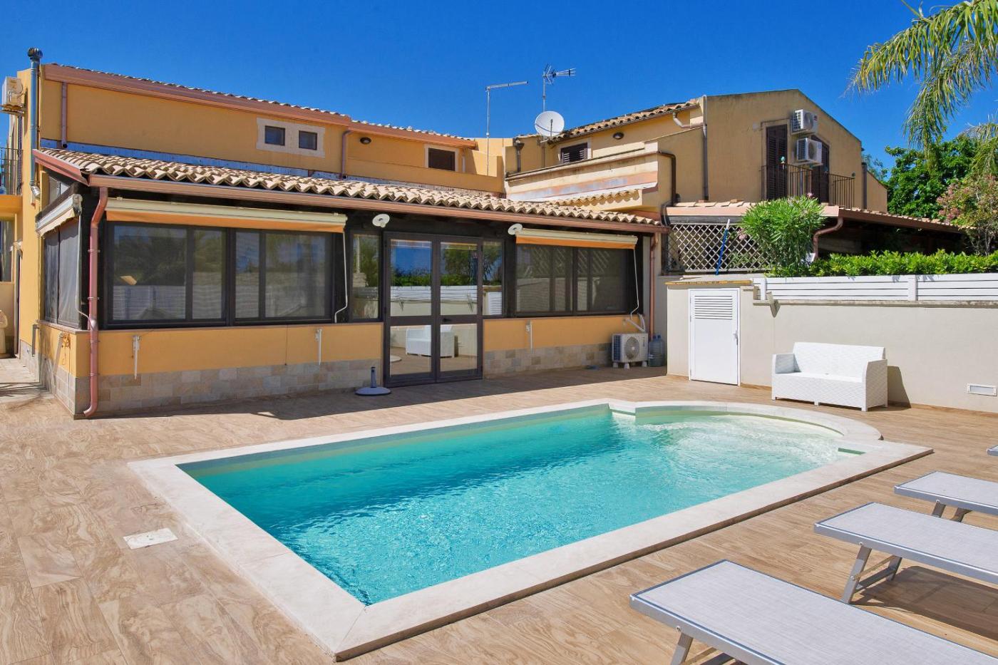 Casa Vacanze. The private pool is the special feature of this holiday home. Featuring a private entrance, this air-conditioned holiday home comprises 1 living room, 2 separate bedrooms and 2 bathrooms with a bath and a shower. Guests will find a stovetop, a refrigerator, kitchenware and an oven in the well-equipped kitchen. The holiday home also provides guests with a barbecue. The holiday home provides a washing machine, a coffee machine, as well as a balcony and an outdoor dining area. The unit offers 4 beds.