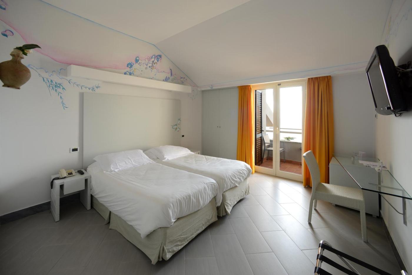 Camera MatrimonialeDoppia con Letti Singoli con Vista Mare Laterale. Climatizzata e dotata di balcone con vista sul mare, la camera matrimonialedoppia con letti singoli dispone di TV satellitare a schermo piatto e bagno privato. ;